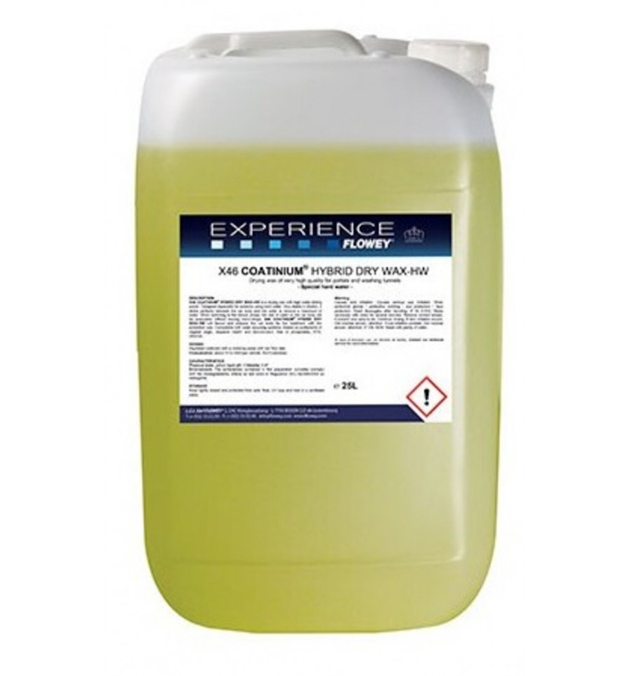 X46-25 FLOWEY COATINIUM HYBRID DRY WAX-HW. Cera de secado de muy alta calidad para pórticos y túneles de lavado. Especial para agua dura. Tecnología COATINIUM®: efecto hidrófugo y brillo óptimo. Cera de secado con un alto poder deslizante del agua. Funciona en agua dura. Se desliza perfectamente entre la carrocería y el agua a fin de evacuar el máximo de agua. Protege y refuerza la pintura. Tacto suave y sedoso de la carrocería. Efecto anti lluvia. Especial para el reciclaje de agua - calidad óptima.