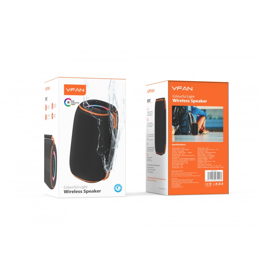 Altavoz portátil impermeable (IPX6) y recargable con un diseño elegante y original. Fabricado con materiales de alta calidad, permite reproducir audio desde tu smartphone o tablet gracias a la conexión Bluetooth 5.3 con TWS. La distancia máxima desde la fuente Bluetooth es de aproximadamente 15 metros.