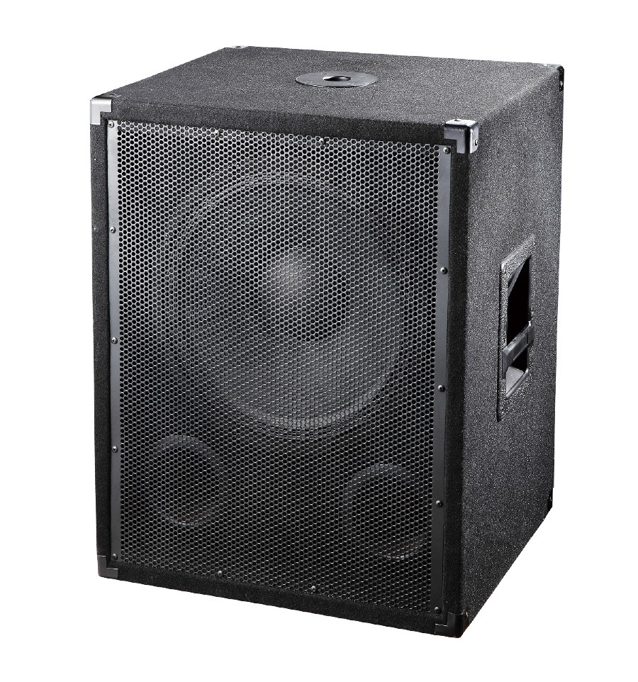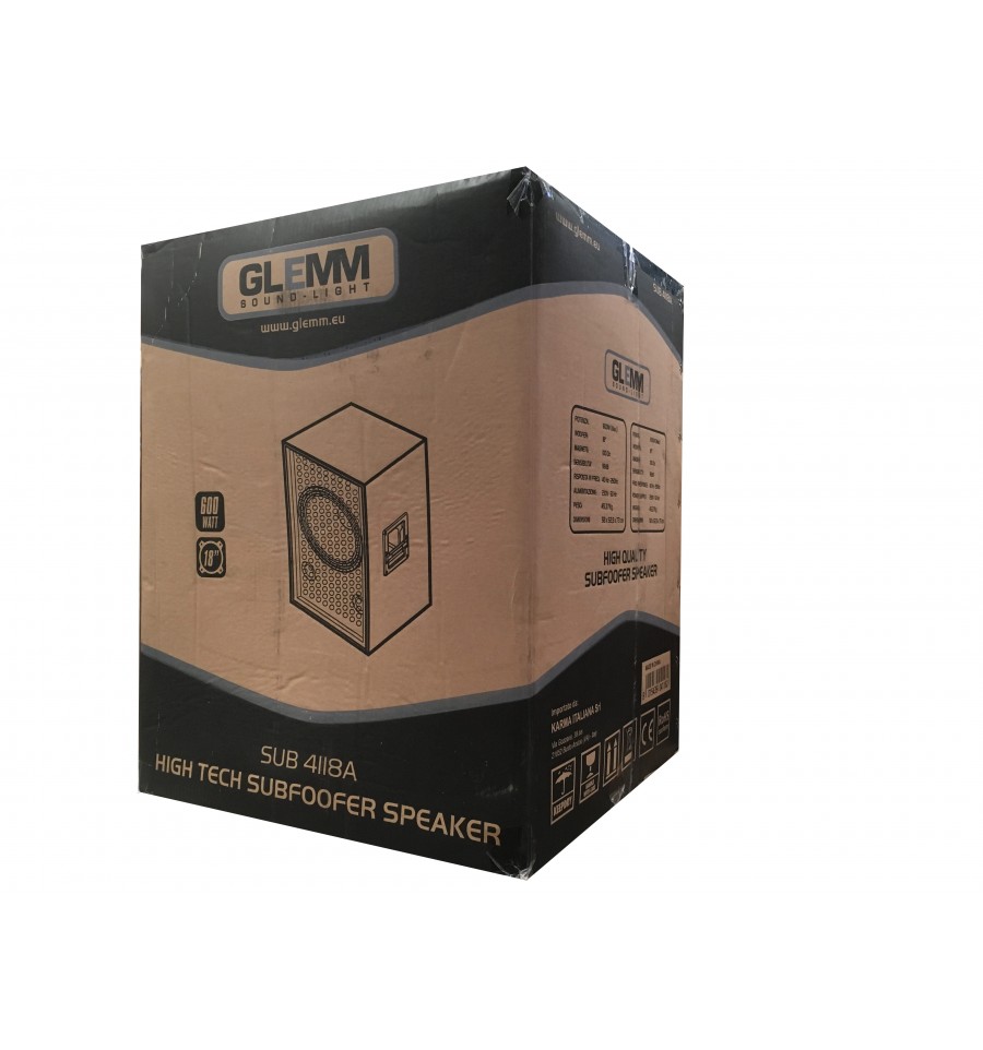 Subwoofer de la marca GLEMM de gran tamaño con woofer de 18" y amplificador dedicado de 600W para la exaltación de los tonos bajos.