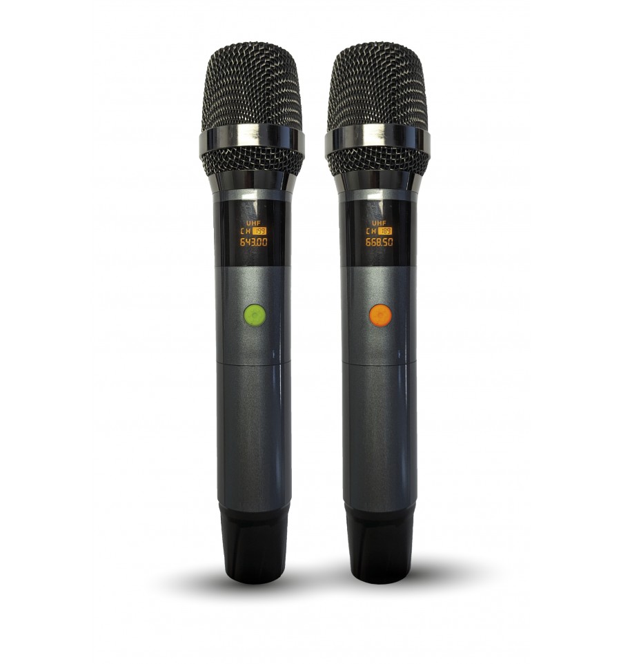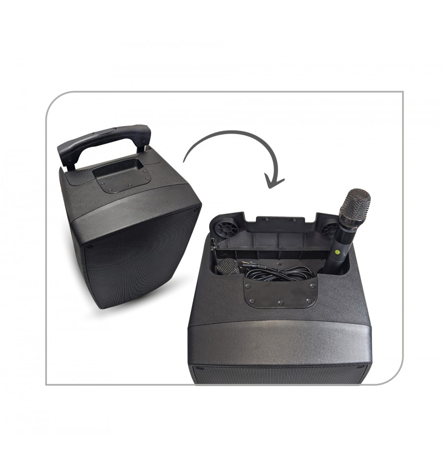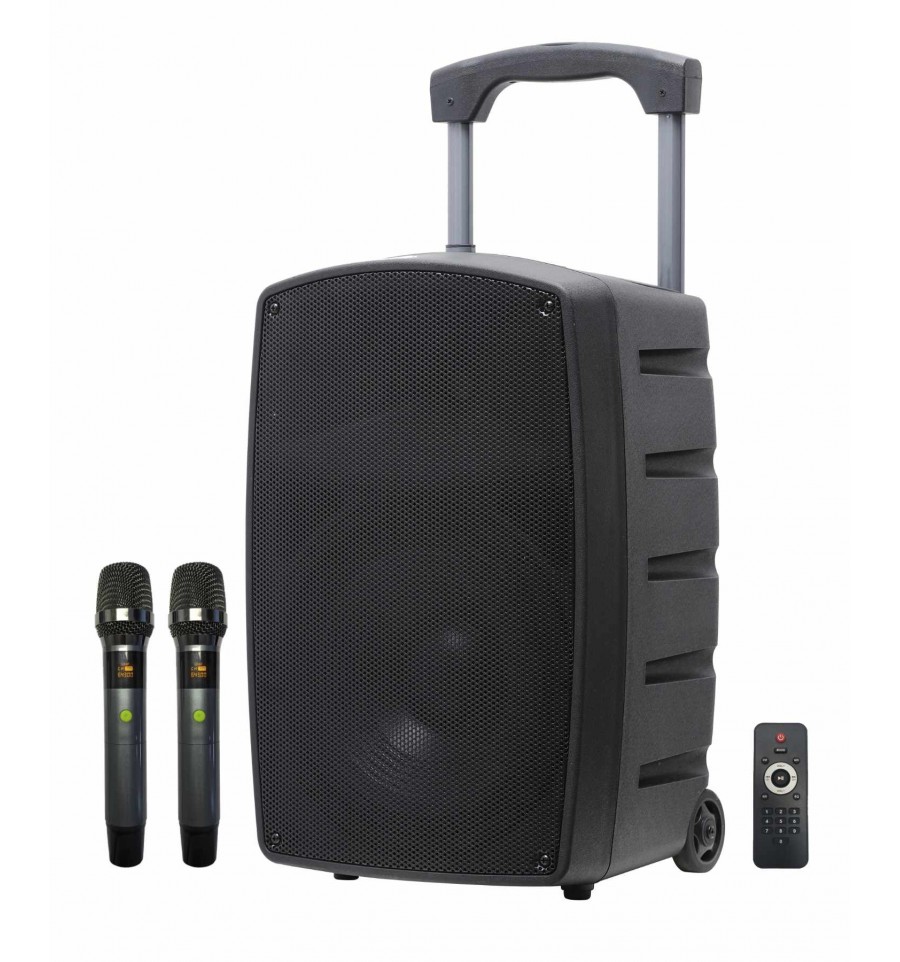 Altavoz profesional amplificado de 12" equipado con doble micrófono radio UHF y mando a distancia.