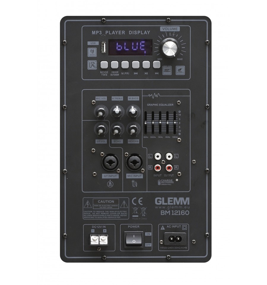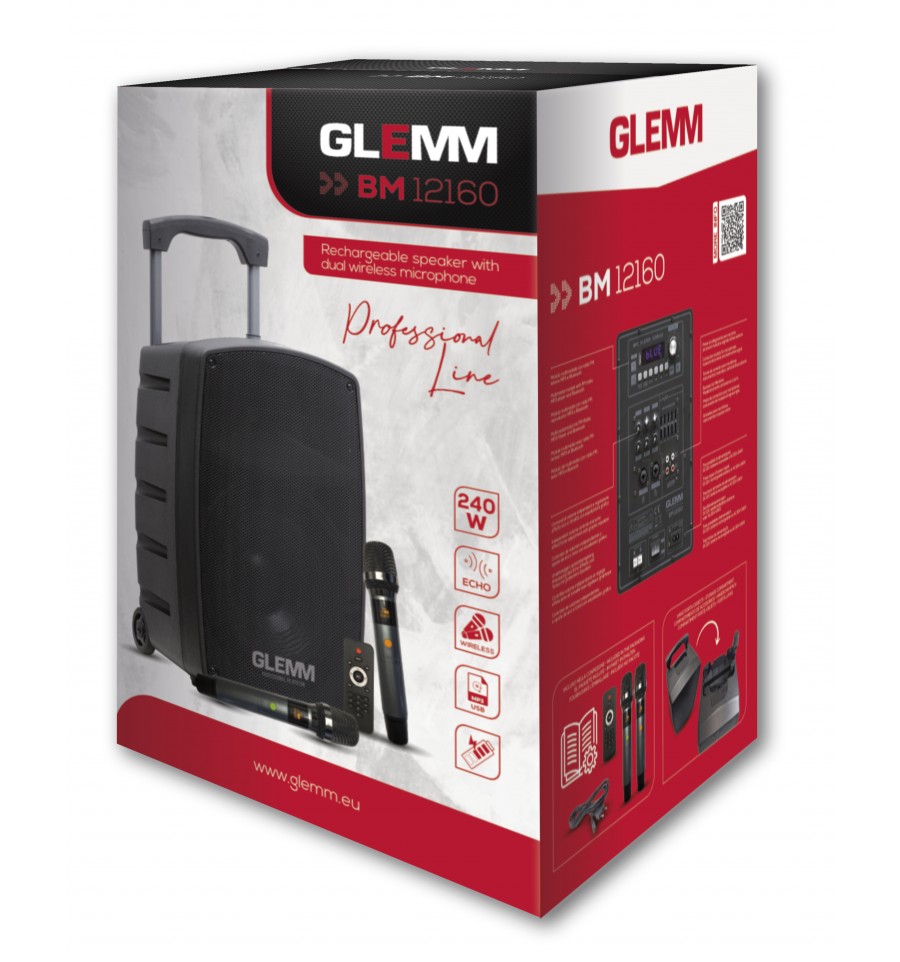 Compra online GLEMM BM 12160 Altavoz profesional amplificado 12" de 240W Max. (120W RMS). Equipado con doble micrófono radio UHF y mando a distancia. Batería recargable.