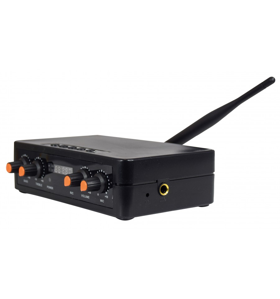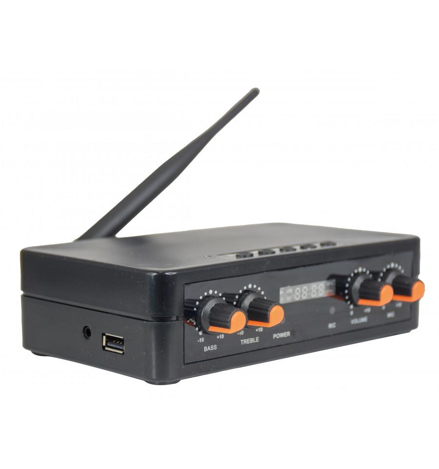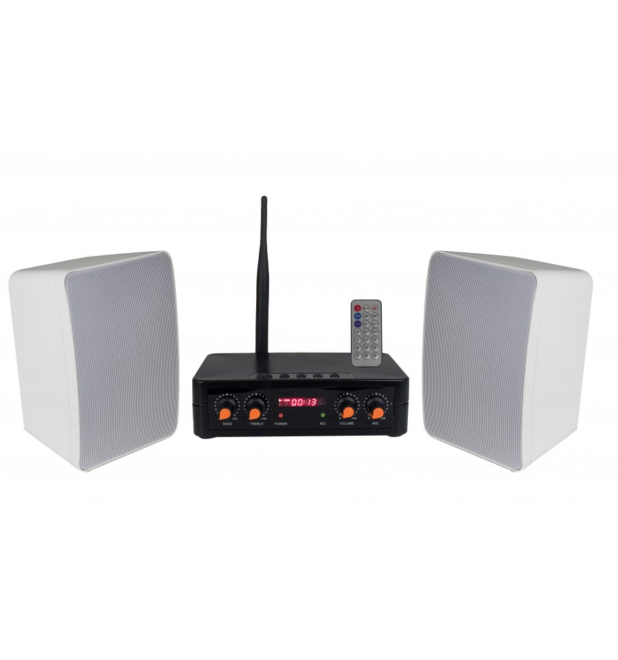 Consta de 2 altavoces amplificados con ajuste de volumen independiente y una unidad de control del transmisor con funciones de radio, Mp3, bluetooth y toma de micrófono.