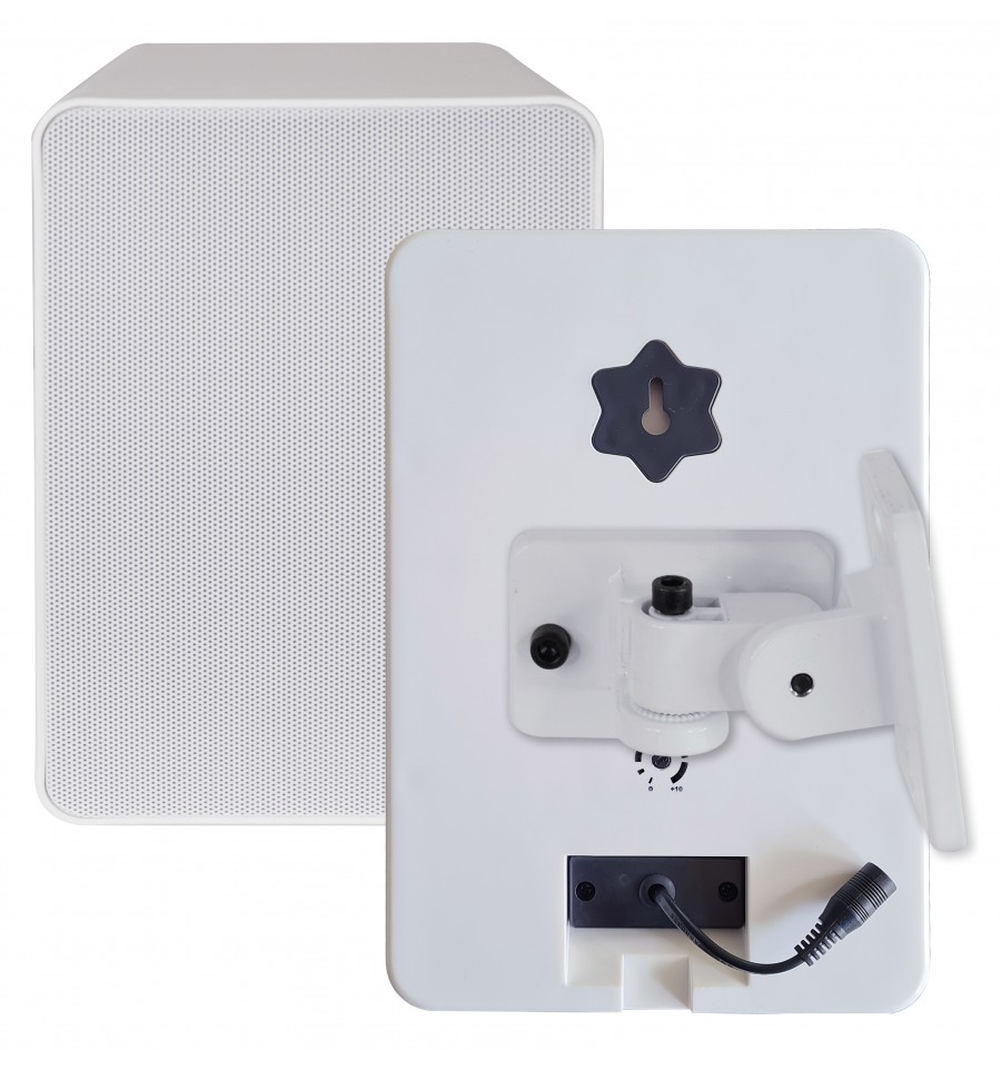 Los altavoces son completamente impermeables y también adecuados para su colocación en exteriores. Se pueden colgar en la pared directamente o utilizando un soporte ajustable suministrado. Su potencia máxima es de 50W cada uno.