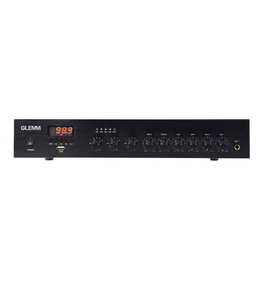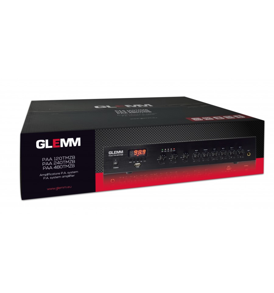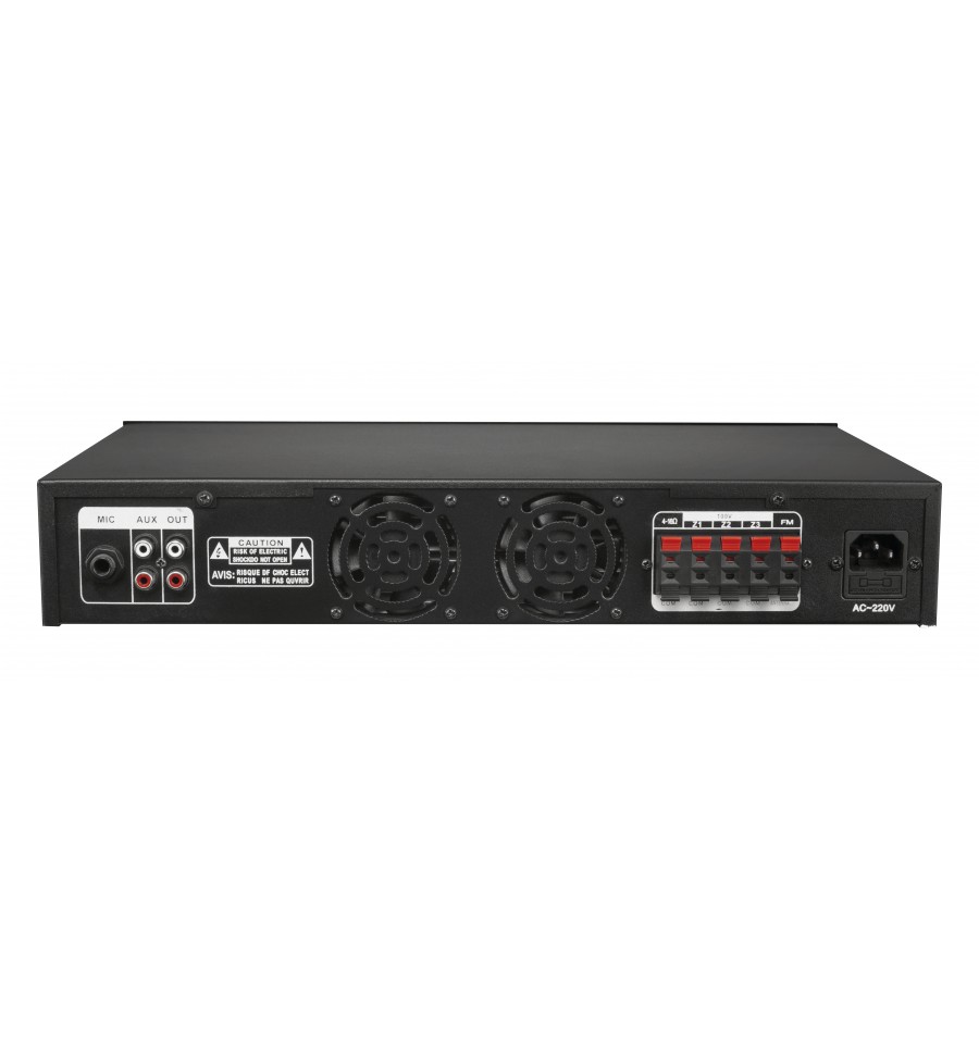 Amplificador que funciona tanto a baja impedancia (4-16 Ohm) como a tensión constante (100V). Su potencia total de 480W puede utilizarse a voluntad en las 3 zonas o estar disponible en la salida de 8-16 Ohm. Las zonas están dotadas de volumen independiente. Cuenta con 2 entradas de micrófono (la primera con función de prioridad), 1 entrada de línea y 1 salida de línea. El reproductor MP3 incorporado puede reproducir canciones desde memorias USB y tiene su propio volumen independiente. También incluye un receptor Bluetooth.