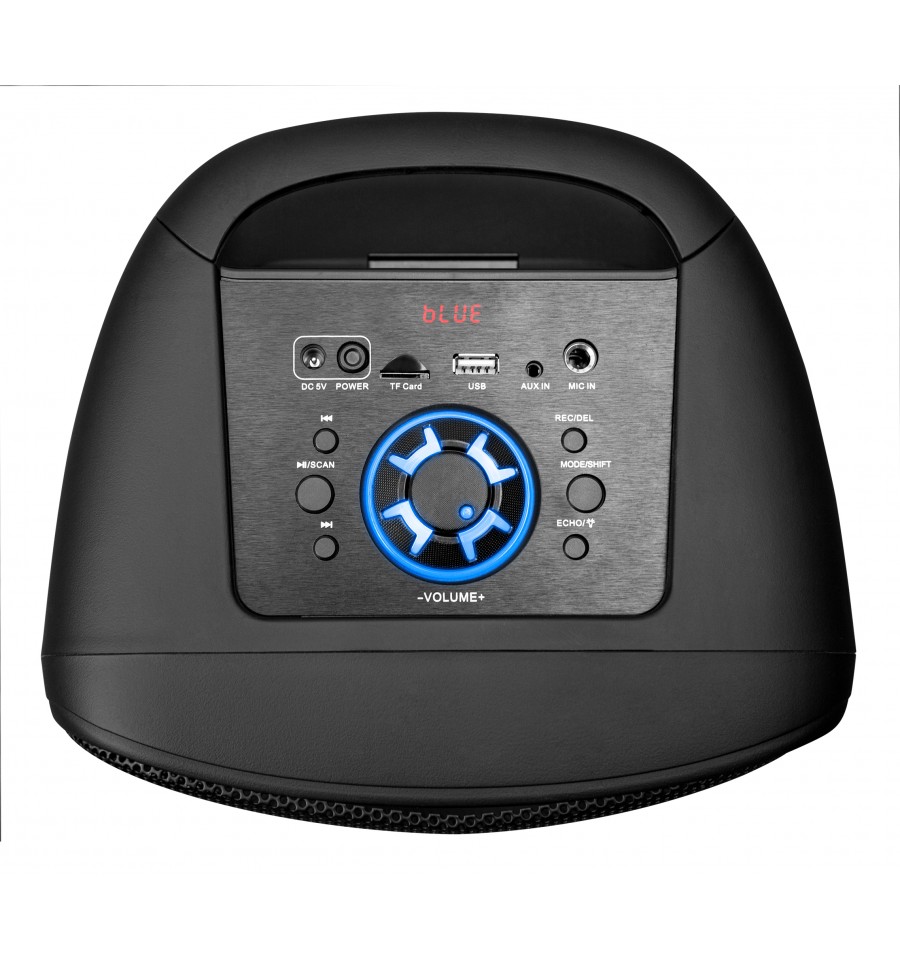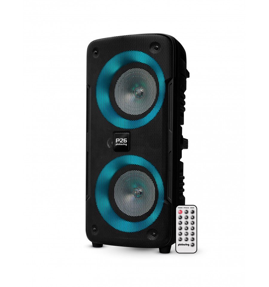 Altavoz amplificado con doble woofer. El sistema de anillos LED ilumina los woofers con efectos multicolores. El control remoto permite el control remoto.