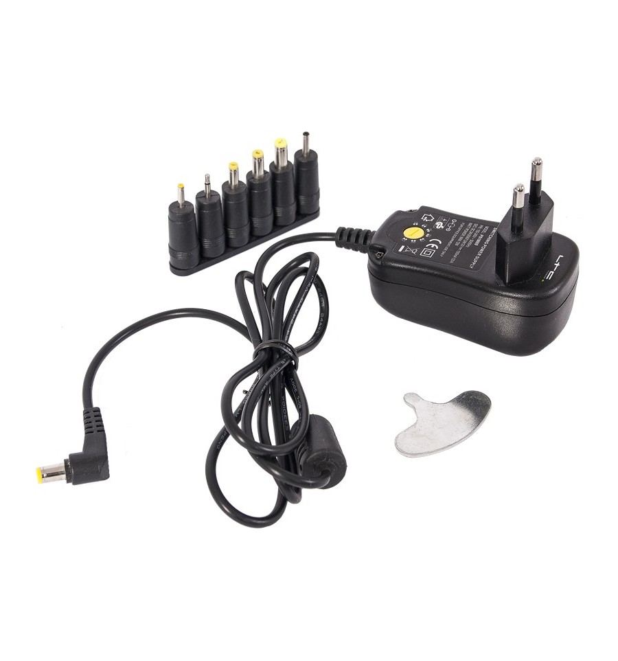 Alimentador estabilizado y conmutado, entregado con 6 clavijas DC adecuadas ala mayor parte de pequeños equipos alimentados con corriente continua, tal y como marcos de fotos digitales, productos de seguridad, routers, consolas de juegos, tabletas y PC portátiles, etc.