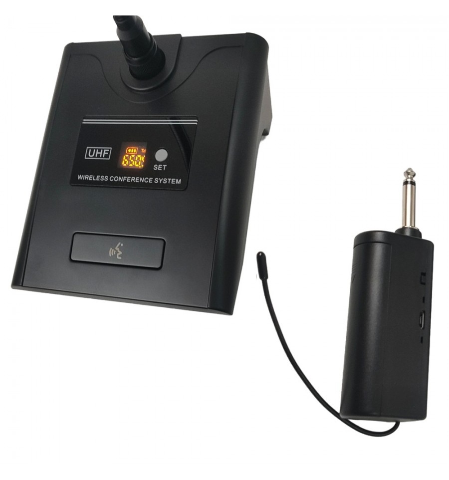 Es un micrófono de condensador con cuello de cisne que incorpora en su base un transmisor inalámbrico UHF y un receptor autónomo alimentado por batería recargable de litio.