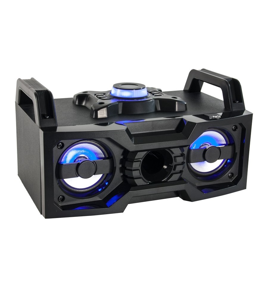 Sistema de sonorización alimentado por una batería recargable con entrada USB y Bluetooth. Los altavoces están iluminados por LED que se iluminan al ritmo de la música en 7 colores. Ideal para los jóvenes que quieren animación en las fiestas entre amigos.