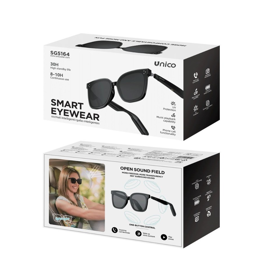 Compra online UNICO SG 5164 Gafas de música Bluetooth con un diseño elegante, estas gafas cuentan con filtro UV para minimizar el daño solar en los ojos. Envío inmediato a toda España
