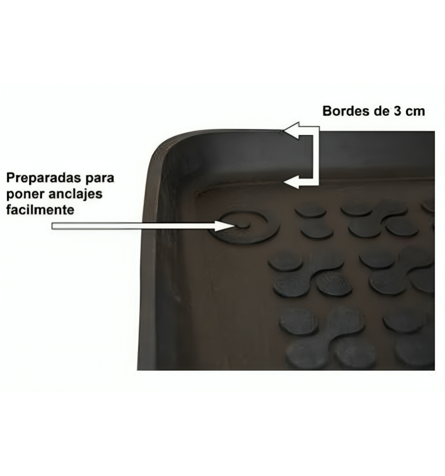 Bordes Perimetrales: Los bordes perimetrales de 3-4 cm atrapan líquidos y evitan que se derramen sobre el suelo del coche, manteniendo todo limpio y ordenado.