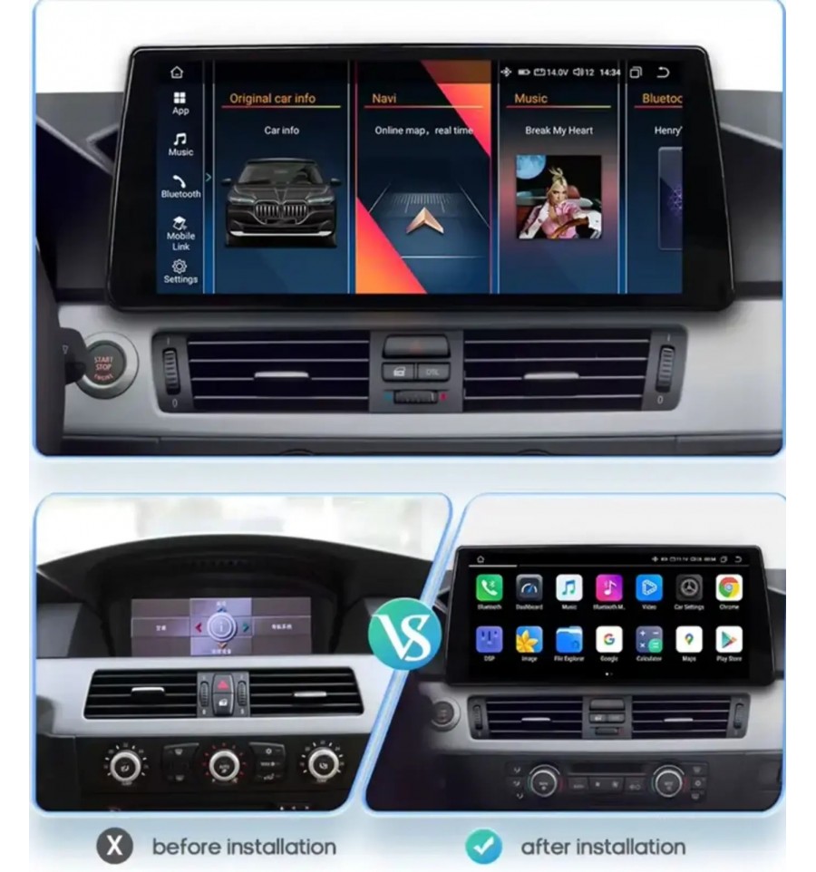 Moderniza el sistema multimedia de tu BMW Serie 5 E60/E61/E63/E64 y Serie 3 E90/E91/E92 (2003-2012) con nuestra pantalla táctil de 10.25 pulgadas HD, diseñada para integrarse perfectamente con el sistema original del vehículo. Con Apple CarPlay y Android Auto inalámbricos, accederás a navegación GPS, multimedia, Bluetooth y WiFi, mejorando la conectividad y funcionalidad de tu BMW.